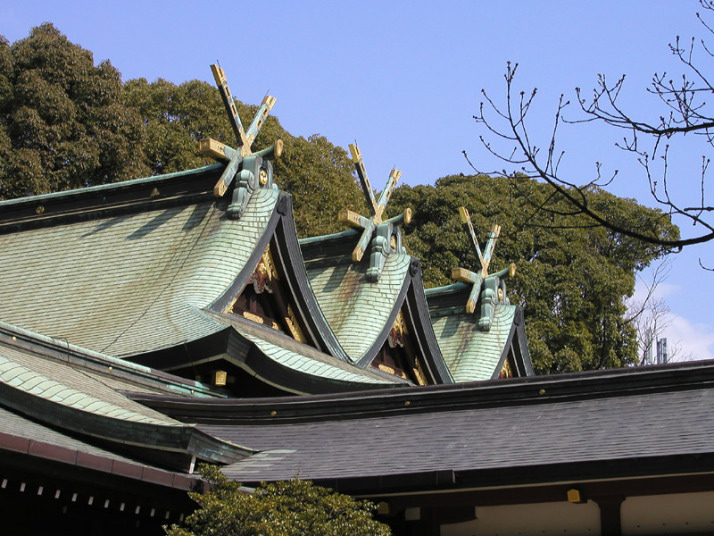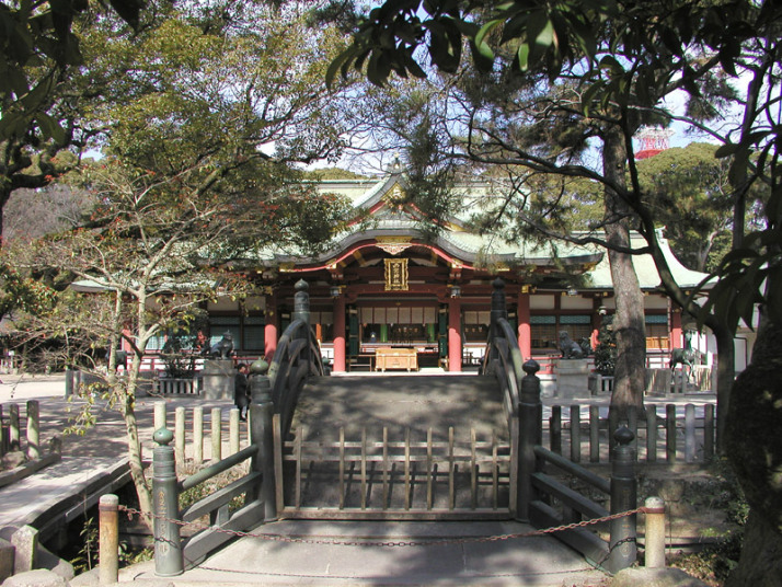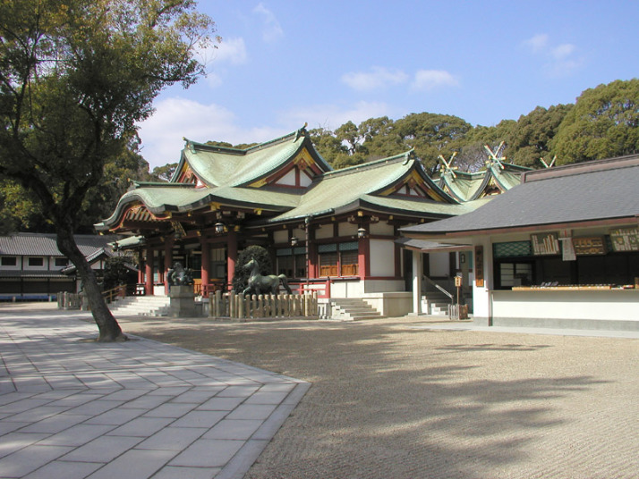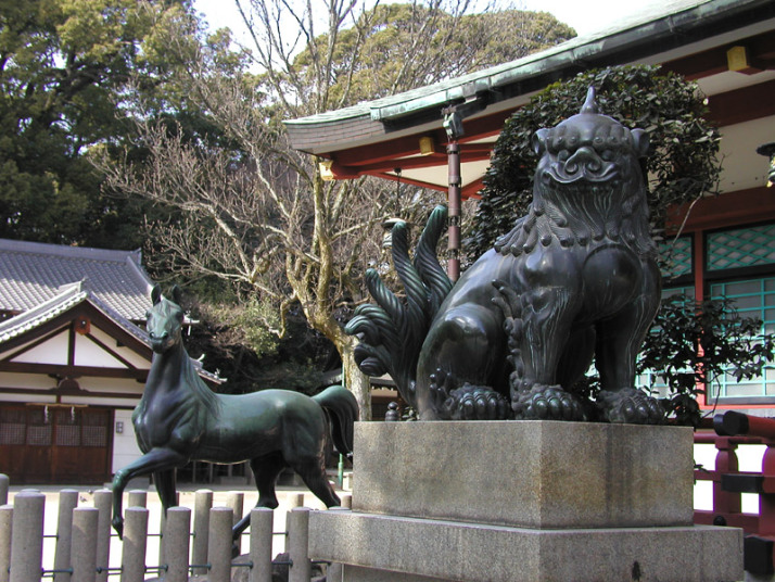 拝殿と本殿 (拝殿の前に池があり太鼓橋がある 拝殿両脇に狛犬と馬の青銅像がある)